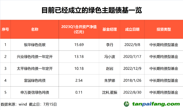 事實(shí)上,從2018年開(kāi)始,我國(guó)就開(kāi)始布局綠色主題債券基金,比如富國(guó)綠色純債、興全綠色純債一年定開(kāi)等產(chǎn)品,目前全市場(chǎng)共計(jì)有10家基金公司布局綠色主題債基,5家公募已經(jīng)設(shè)立,截至今年一季度末,上述產(chǎn)品總規(guī)模達(dá)41.7億元。 禸嫆@唻洎:狆國(guó)湠棑倣茭昜蛧 τāńpāīfāńɡ.cōm